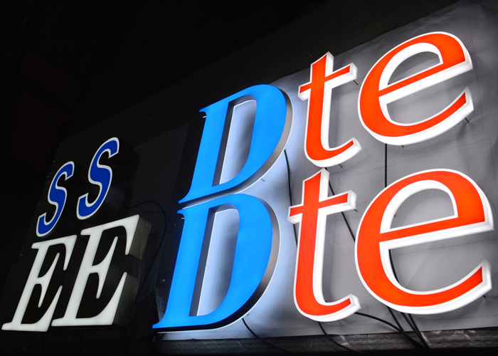 平面迷你發(fā)光字由字殼、底板、LED燈構(gòu)成。字殼由雕刻機掏空切割而成,底板等離子切割出來,內(nèi)部裝入LED燈,用有機膠水粘合固定。
