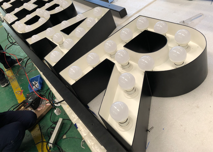 一種復(fù)古的工藝發(fā)光字,一般由金屬底座和包邊組成,光源則采用球形燈或鎢絲燈等,發(fā)光高亮醒目。
