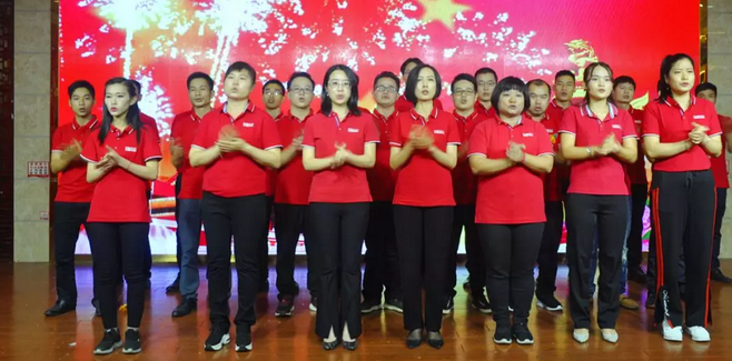 聯(lián)歡會(huì)結(jié)尾部門(mén),全場(chǎng)觀眾在管理層代表、員工代表的大合唱節(jié)目的帶領(lǐng)下,全場(chǎng)起立一起歌唱祖國(guó)。隨后的團(tuán)年晚宴,大家紛紛舉起酒杯互相祝賀。